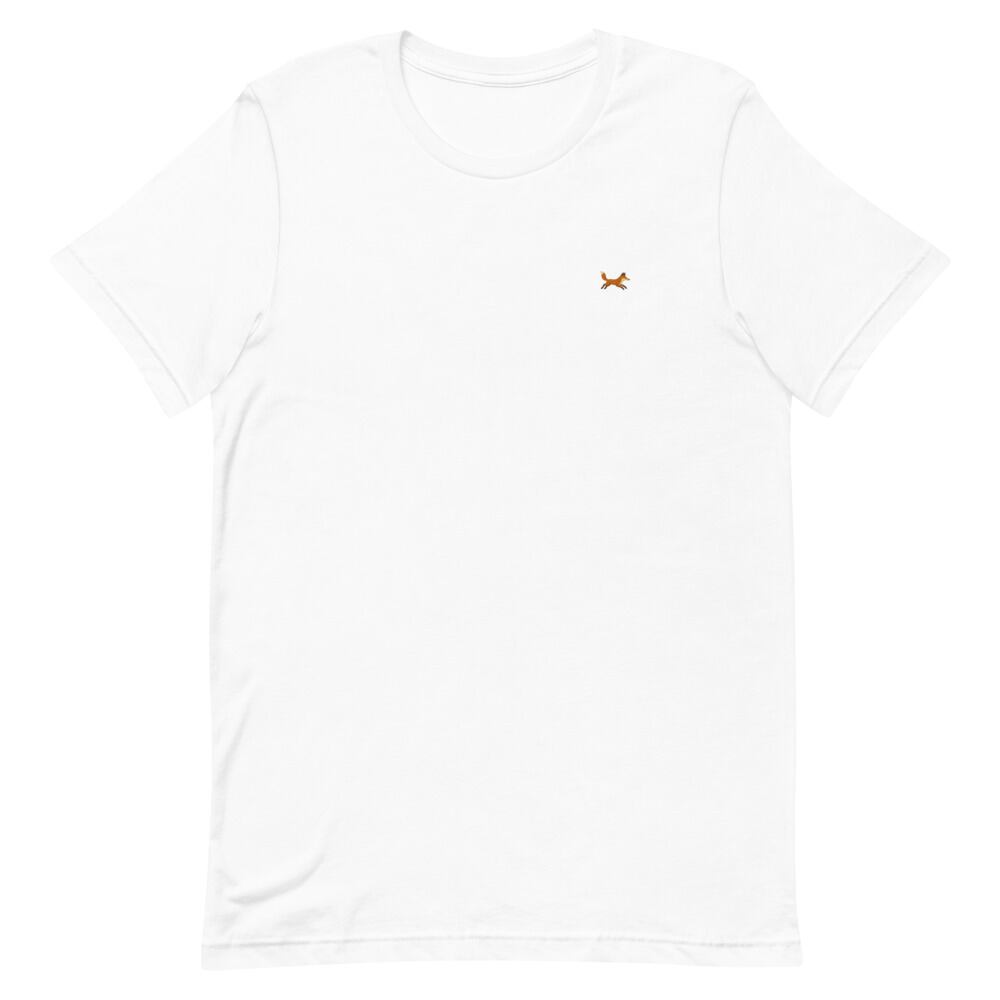 胸元に刺繍風のワンポイントであしらった、走るキツネの姿が印象的なTシャツ。