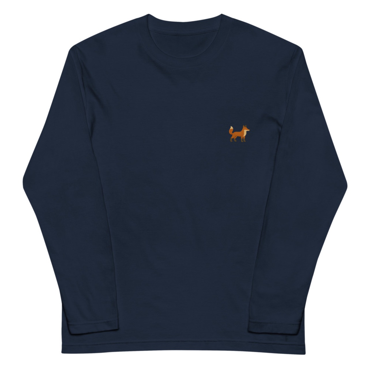 胸元に刺繍風のワンポイントであしらったキツネの佇まいが印象的なロングTシャツ。